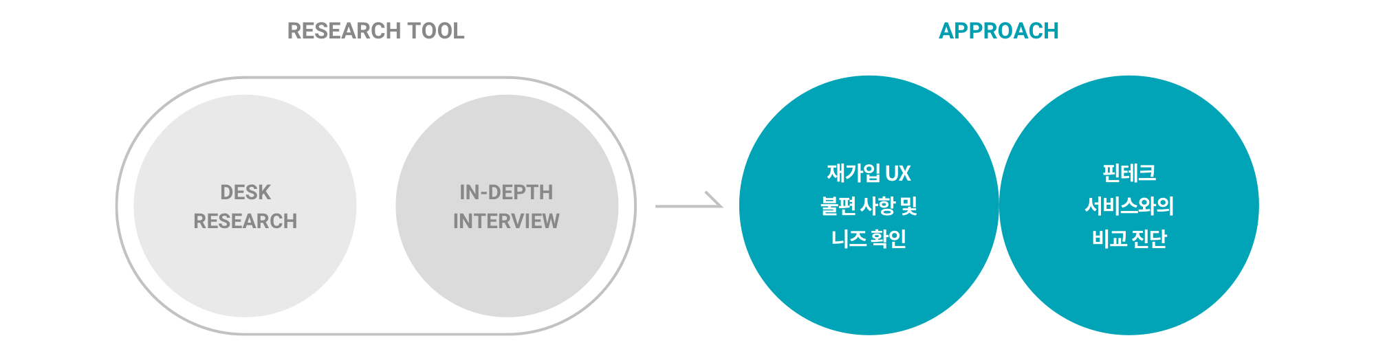 이에 따라 문제 해결을 위해 NRED는 재가입 UX에 대한 불편사항 및 니즈를 발견하고 핀테크 서비스와의 비교 진단을 하는 방식으로 Approach를 제시하였습니다.