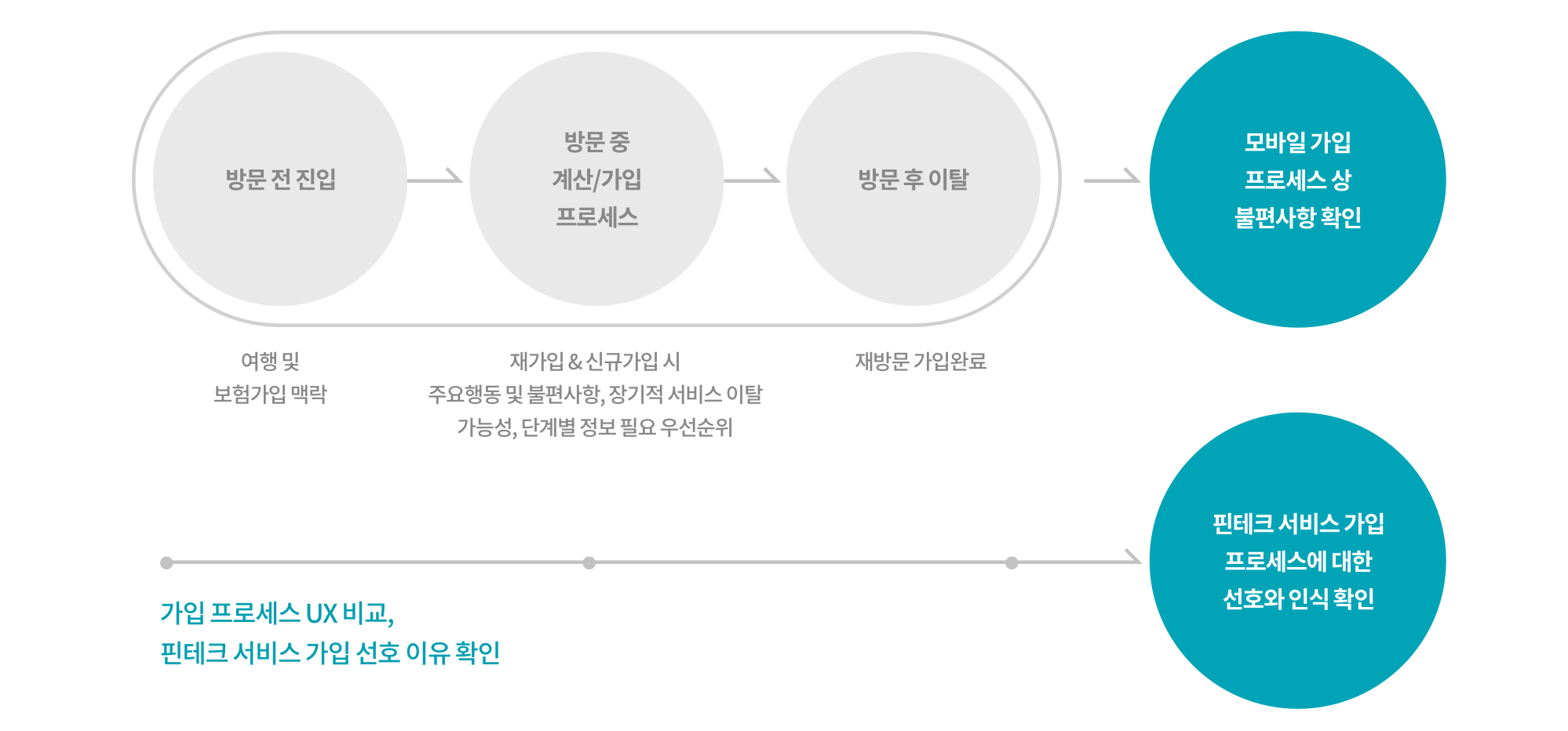 리서치 목표 수립을 위해 재가입과 신규 가입의 프로세스 상 각 주요 행동 및 불편사항, 이탈 가능성을 위주로 확인하고 핀테크 서비스와 삼성화재 가입 프로세스의 UX비교를 통해 핀테크 서비스 가입 선호도 및 인식 또한 함께 파악하기로 했습니다.