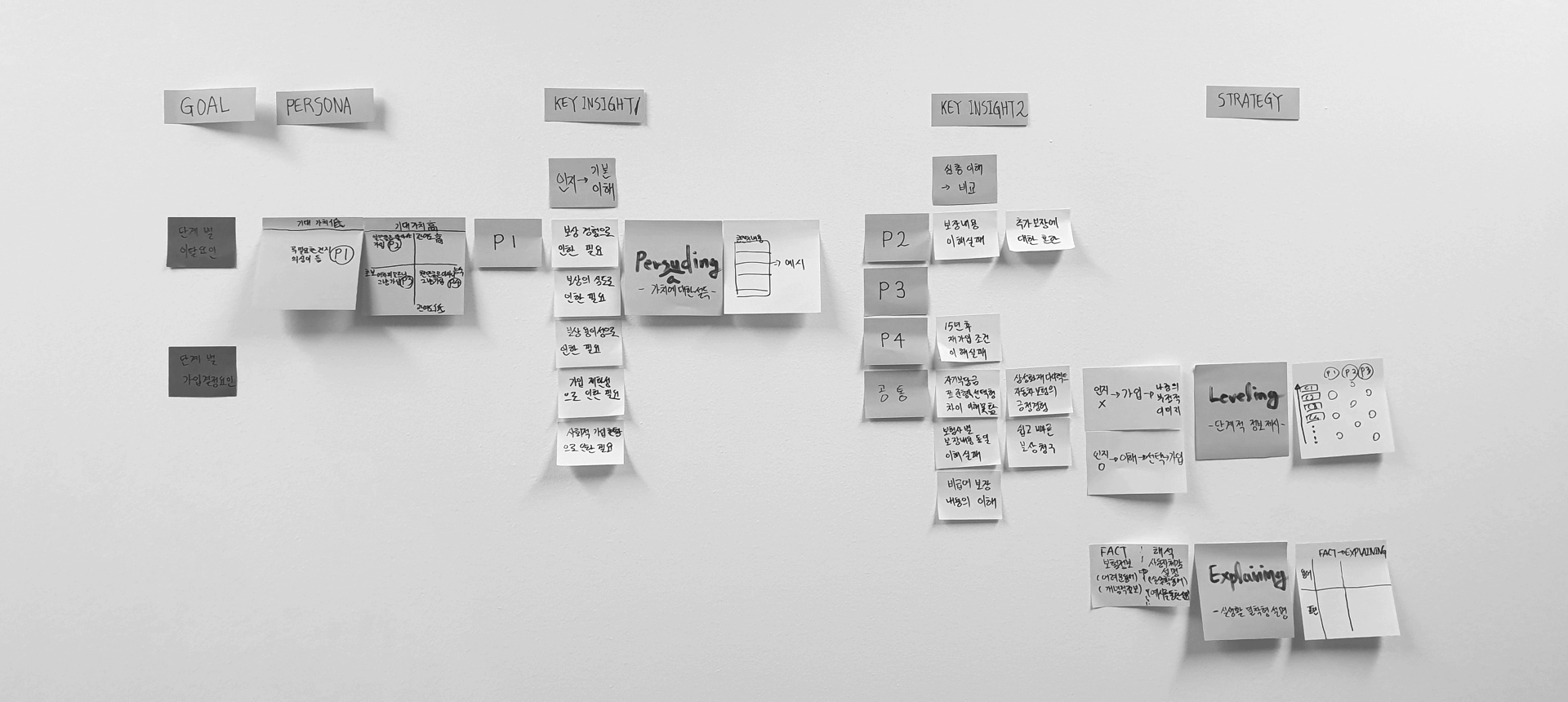 인뎁스 인터뷰 이후 사용자 맵핑을 통해 관여도와 능숙도에 따라 행동, Needs, Painpoint의 패턴이 다름을 확인하였습니다. 그리고 이를 통해 보험을 가입하는 과정 상의 행동 특성에 따라 Persona를 도출하여 프로세스 내 유형 별 각 단계의 니즈, 불편 요인에 대한 흐름을 정리하여 분석하였습니다.